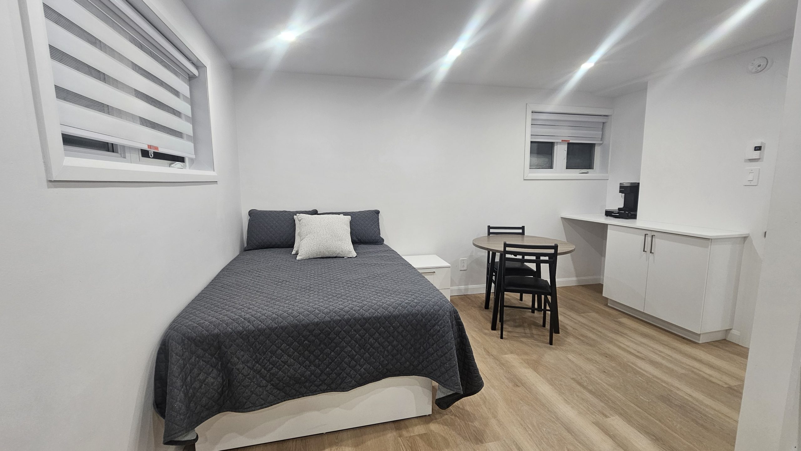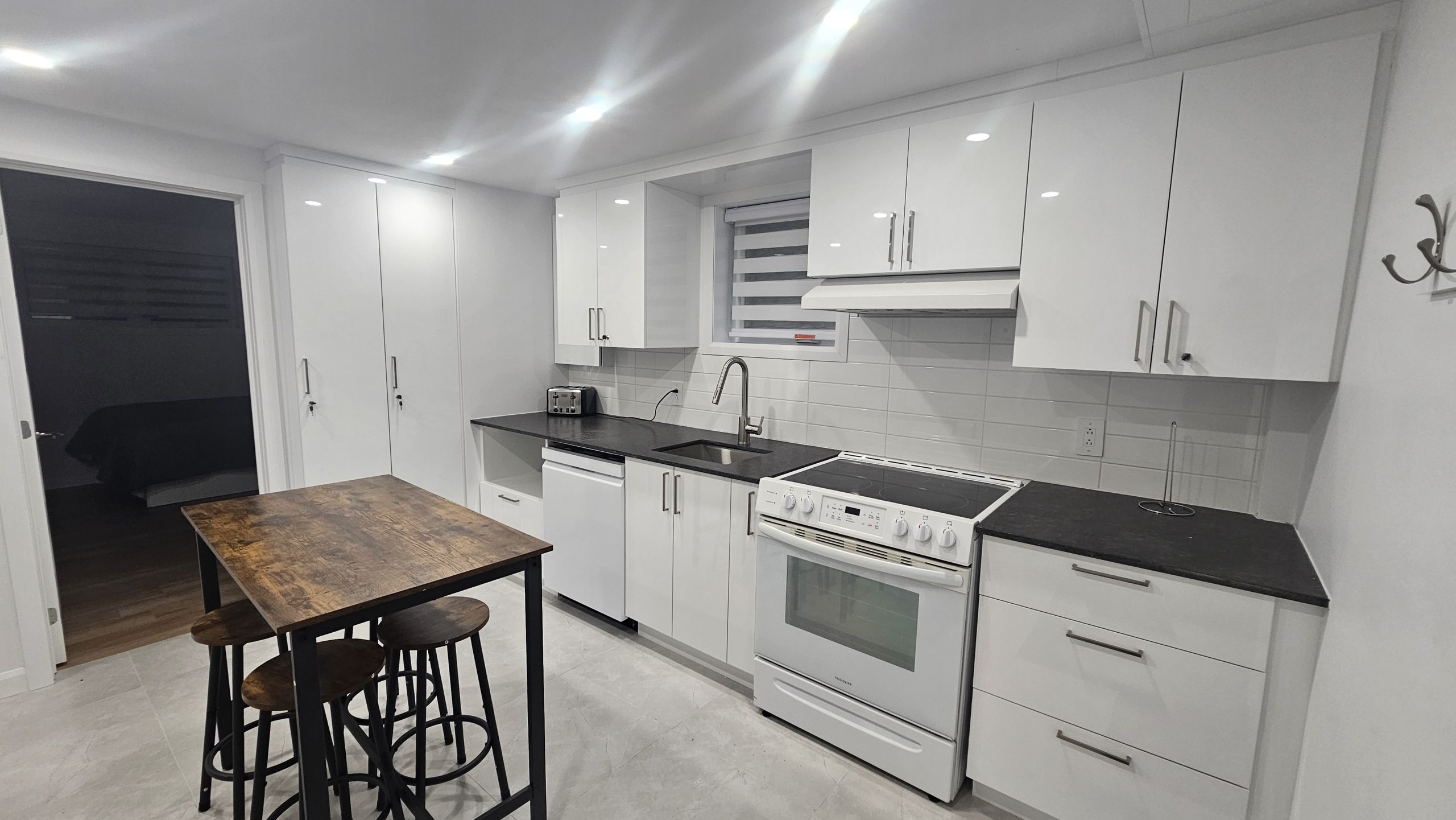 Votre unité dispose d’un lit double, d’un sofa confortable, d’une table à manger, d’un bureau de travail ergonomique avec chaise, d’une TV murale, d’une bibliothèque et de grandes armoires de rangement encastrées. Votre salle de bain est entièrement privée, avec bain/douche, vanité contemporaine et tuiles grises modernes. Une cuisinette personnelle complète votre espace pour les petits repas du quotidien. La cuisine commune entièrement équipée — cuisinière, lave-vaisselle, armoires laquées blanches et comptoirs noirs — ainsi que la buanderie sont partagées exclusivement entre les deux colocataires, avec accès verrouillé dédié. Chauffage, électricité, internet haute vitesse et un stationnement sont inclus dans votre loyer.